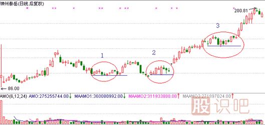 神州泰岳(300002)在上市后出現(xiàn)了三次平底結(jié)構(gòu),圖中1和2構(gòu)造了股價(jià)啟動(dòng)前的雙底結(jié)構(gòu),3是波段性底部。從該股走勢(shì)看,該股多采用平底橫盤整理,這正是超級(jí)強(qiáng)勢(shì)股的特征,大家仔細(xì)觀察一下,這三處K線成交量都是萎縮的,而且后面都跟著一根大陽(yáng)線,特別是2處后面跟的是一根接近一字板的漲停K線,這些都符合實(shí)戰(zhàn)要點(diǎn)。