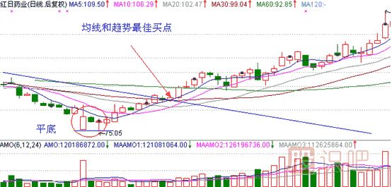 如上圖所示,在某一下降趨勢(shì)中,股票K線下端,即最低價(jià)在某一水平區(qū)域平齊, 這意味著股價(jià)在此水平位置連續(xù)獲得支撐,此區(qū)域很可能成為股價(jià)調(diào)整的階段性底部區(qū)域。這里需要注意的是,平底形態(tài)一般多出現(xiàn)在股票走勢(shì)的波段性調(diào)整底部,所謂平底也不要求底部100%平齊,只要求K線最低價(jià)大體在同一水平位置即可。同樣的穩(wěn)健的投資者在出現(xiàn)平底之后也不可貿(mào)然入場(chǎng),只有均線最佳買點(diǎn)和趨勢(shì)最佳買點(diǎn)出現(xiàn)后才適合入場(chǎng)掃貨。