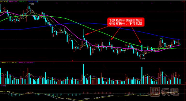 ③在強(qiáng)勢拉升一波后的高位的跳空突破缺口也要慎重操作,以防止莊家誘多高開沖高向下瘋狂拋售