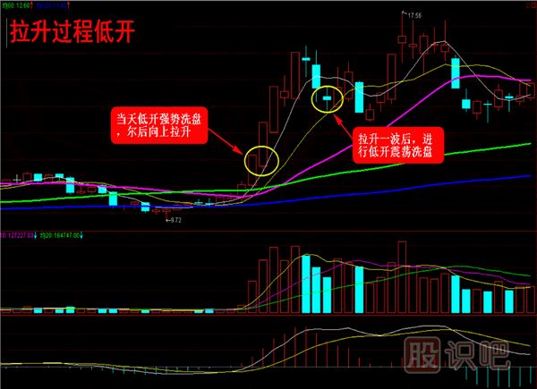 拉升過程的低開,往往意味著莊家通過低開再拉升,或者低開向下震蕩的方式進(jìn)行強(qiáng)勢(shì)洗盤,以洗出獲利盤,減輕再次拉升的拋壓。