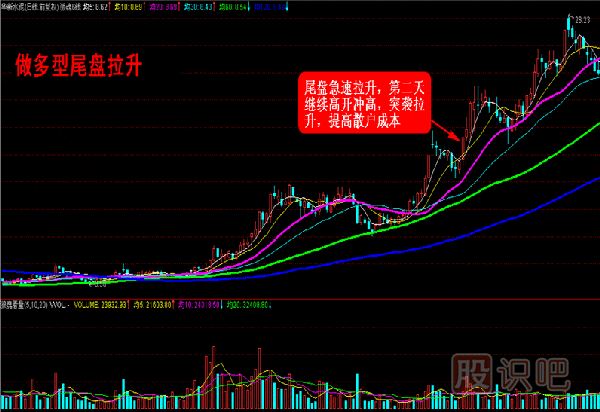 做多型拉升往往是指莊家在建倉完畢后,計(jì)劃快速拉升,以迅速脫離成本區(qū),讓更多的散戶在更高的價(jià)格才能夠吃到貨,采用尾盤急速拉升的手法,多見于上漲階段。