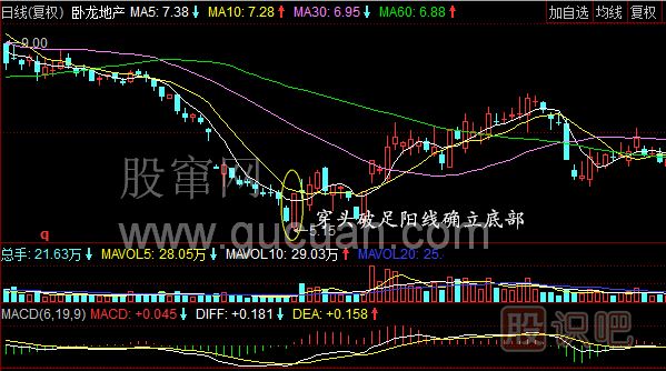 實(shí)例2:2010年5月5日,臥龍地產(chǎn)(600173)在經(jīng)過很長一段時間的連續(xù)下跌之后,順勢低開,此時很多投資者由于內(nèi)心的恐懼,在低位選擇割肉賣出。但就在當(dāng)日低開反復(fù)震蕩后,上午收盤前該股卻迅速大幅拉升,在K線形態(tài)上形成了穿頭破足陽線,將前一天的陰線全部吞掉,這顯示多頭力量非常強(qiáng)勁,隨后,該股確立了底部,穩(wěn)步震蕩上行,如圖所示。