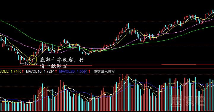 但指數(shù)自跌到1664點(diǎn)以后,卻不再繼續(xù)單邊下跌,而是展開了橫向的弱勢整理。2008年11月6日收出了一根縮量的十字星,次日即11月7日上證綜指大幅低開,投資者恐慌到了極點(diǎn),紛紛拋售。但當(dāng)日指數(shù)低開高走,收出了一根大陽線,與前一個十字星形成了一組穿頭破足陽線的走勢,這是明確的見底信號,很多激進(jìn)的投資者在此點(diǎn)位選擇入場,之后上證指數(shù)一路上揚(yáng),走出了翻番的走勢,如圖所示。