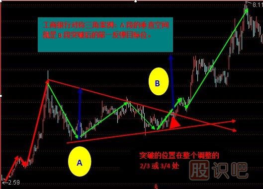 3.空間的測算:一旦完成有效突破(3%~5%的放量長陽),三角的底邊空間就是突破后的第一目標(biāo)位。