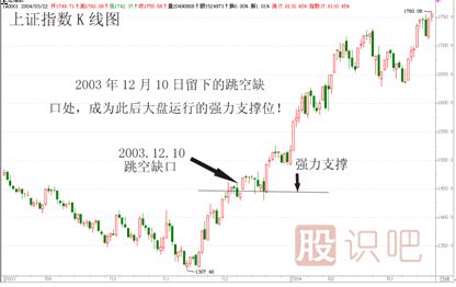 如2003年12月10日大盤留下一個跳空缺口,其后,近兩周的時間,每次打到缺口附近,指數(shù)都被拉起,直到一根大陽線,拔地而起,一輪加速上揚行情展開。(見下圖)