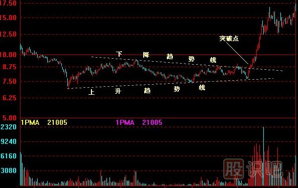 對稱三角形由一系列的價(jià)格變動所組成,其變動幅度逐漸縮小,亦就是說每次變動的最高價(jià),低于前次的水準(zhǔn),而最低價(jià)比前次水準(zhǔn)為高,呈一壓縮圖形,如從橫的方向看股價(jià)變動領(lǐng)域,其上限為向下斜線,下限為向上傾線,把短期高點(diǎn)和低點(diǎn),分別以直線連接起來,就可以形成一相當(dāng)對稱的三角形。對稱三角形成交量,因愈來愈小幅度的股價(jià)變動而遞減,然后當(dāng)股價(jià)突然跳出三角形時(shí),成交量隨之變大。