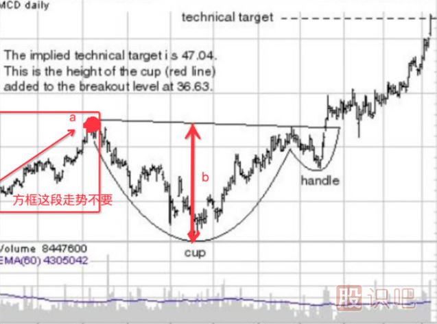 與此相關(guān)的是,杯的深度也是具有爭議性的,我們通常認為,一個標準杯的底部至少要比杯的左半部分高點要低20%,但不應(yīng)超過40%,例如,若杯的左半部分高點為100元的話,則杯的底部應(yīng)當處于60元(低20%)至80美(低40%)之間。