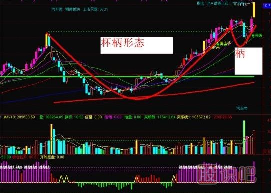 4、柄:有時候,這個柄會以向下傾斜的旗形或者小三角形態(tài)出現(xiàn),有時候則只是一個簡單的小幅回撤。柄回撤的幅度可以達到杯上漲高度的1/3,最好不要超過這個幅度。柄回撤的幅度越小,該形態(tài)的牛性就越足,突破時表現(xiàn)得也越顯著。