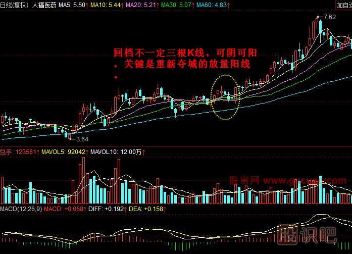 有時候回檔不一定是三根陰線,也可能是陰陽互摻,但本質(zhì)是一樣的,中途的多根短K線的作用也是回檔,清洗掉又一批散戶,然后再繼續(xù)拔高。為什么主力老洗盤,老是想散戶拋籌碼?要知道,主力賺錢都是建立再散戶不賺錢的基礎(chǔ)上的。只有在主力想走人的時候,才是真心地希望大量散戶買入的時候。