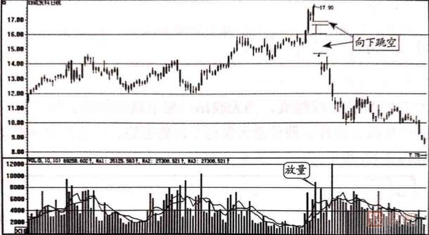 如圖1-40所示的是成發(fā)科技(600391)的日k線走勢圖。該股從前期低點11.50元開始了一輪上升行情,最高漲到了近18.00元,漲幅已經(jīng)接近60%。隨后,在圖中標(biāo)識處形成了連續(xù)兩個向下跳空的走勢,第一次留下的跳空缺口比較小,但是出現(xiàn)跳空的當(dāng)天成交量出現(xiàn)了明顯的放大,也就是下跌放量;第二個跳空缺口非常大,幾乎是前一個跳空缺口的5~6倍之多,股價也以跌停報收。這種走勢已經(jīng)很明顯地預(yù)示了未來股價的下跌趨勢。 因此,投資者必須及時賣出手中的持股,以規(guī)避后市大幅下跌帶來的風(fēng)險。