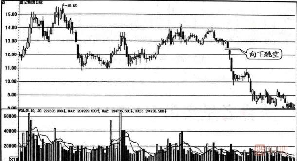 向下跳空中的股價在第二天的運行中空方的力量明顯比多方的力量要強得多。 如果這種走勢是出現(xiàn)在股價長期或大幅上漲的頂部高位區(qū)域,則標(biāo)志著股價出現(xiàn)下跌的可能性相當(dāng)大;如果向下跳空出現(xiàn)在股價下跌的中途,往往是股價進人加速下跌的征兆。 無論股價出現(xiàn)在哪一個位置,都是投資者減倉或清倉的時機。