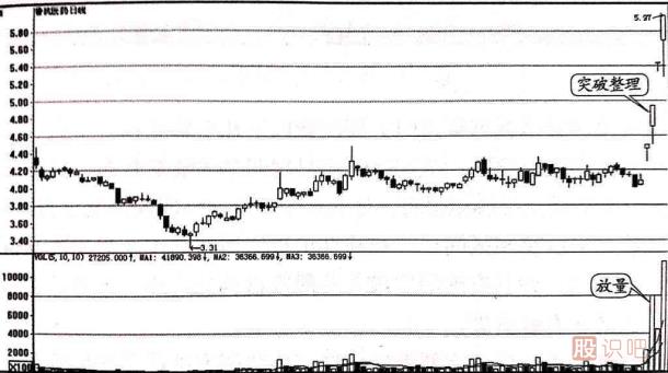 突破整理是指股價(jià)在經(jīng)過一波上漲后,在一定的上下區(qū)間內(nèi)進(jìn)行橫盤整理,突然有一天走勢(shì)圖中出現(xiàn)一根明顯放量的大陽(yáng)線一舉突破整理區(qū)間高點(diǎn),形成新一波的漲勢(shì)行情,如圖1-3所示。接下來由股識(shí)吧來給您議單根K線突破整理買入,不明白的就來看看。