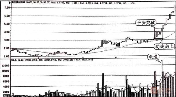 如圖1-4所示的是華鑫股份(600621)的周K線走勢圖。 該股從前期的4.00元附近大幅下跌到了2.00元附近,跌幅已經(jīng)高達50%,隨后股價企穩(wěn)筑底,30周均線也開始在低位轉(zhuǎn)為走平并向上,這時股價已經(jīng)運行到了30周均線的上方,在圖中方框內(nèi)出現(xiàn)了寶塔線平頭突破的走勢,連續(xù)三根寶塔線的高點均處于同一水平,最后一周的股價平開高走,在突破前三周高點時的成交量放大,比前一周的成交量要大上四分之一。這說明股價經(jīng)過三周的橫盤整理后開始向上突破,在中線趨勢向上不變的背景下,投資者應(yīng)于平頭突破的當(dāng)周果斷買入。