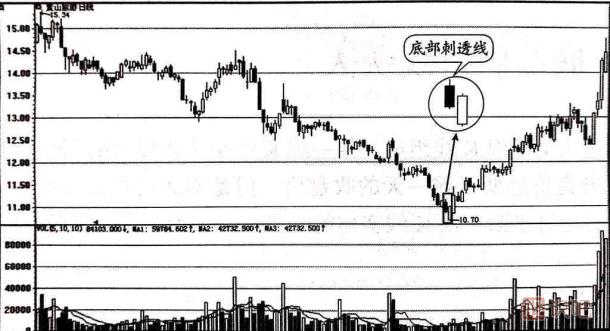底部刺透線由兩根K線組成,第一根K線是實體較大的陰線,第二根K線跳空低開,開盤價遠(yuǎn)低于前一天的收盤價,但是不久后在買盤的推動下價格回升并且收盤價超過了第一根K線實體的一半以上,形成了一根低開高走的陽線,如圖1-3所示。接下來由股識吧來解釋多根K線底部刺透線買入,皇天不負(fù)有心人,看完下文終于讓你知道。