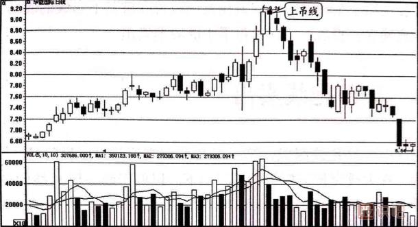 上吊線(xiàn)一般出現(xiàn)在上漲行情的頂部,它可以是陰線(xiàn)也可以是陽(yáng)線(xiàn),特征是實(shí)體很小,帶長(zhǎng)下影線(xiàn),下影線(xiàn)的長(zhǎng)度最好是實(shí)體部分的2~3倍,下影線(xiàn)越長(zhǎng),就越具有實(shí)戰(zhàn)指導(dǎo)意義,如圖1-19所示。接下來(lái)由股識(shí)吧來(lái)跟你議單根K線(xiàn)上吊線(xiàn)賣(mài)出,我們一起來(lái)看看。