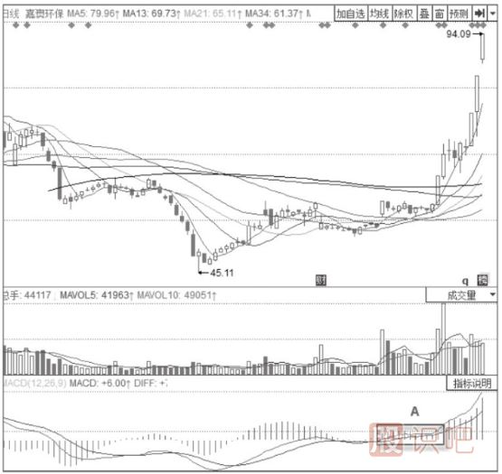 圖4-7是新宏澤(002836)的日線圖。圖中,在KDJ指標(biāo)經(jīng)歷了A段50線以上的向上運(yùn)行后,J線在位于K線和D線之上運(yùn)行的情況下,在M區(qū)域出現(xiàn)了向下與K線和D線的交叉,形成了KDJ“死叉”,說明股價即將轉(zhuǎn)為下跌趨勢,因此投資者在此時賣出股票。