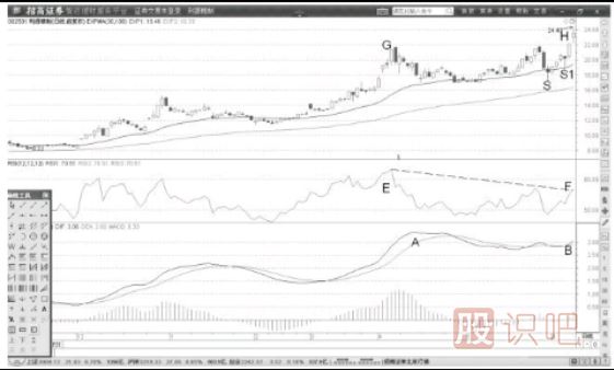 在背離前,價(jià)格在S和S1位置出現(xiàn)下影線K線形態(tài),影響很長,盤口價(jià)格調(diào)整力度很高。一般認(rèn)為這是股價(jià)典型的頂部特征。股價(jià)跳空上漲,這是多方資金誘多拉升的最后一次強(qiáng)勢表現(xiàn)。背離很好地提醒我們頂部信號,拋售股票機(jī)會就在跳空陽線出現(xiàn)以后。