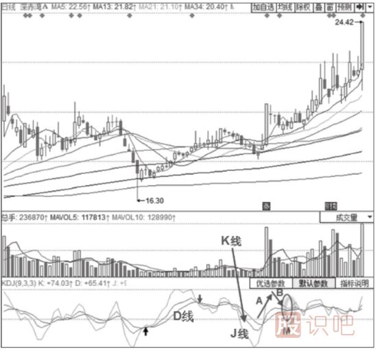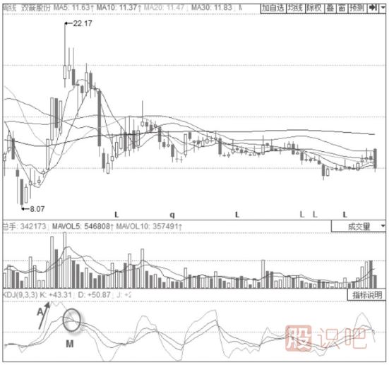 股票圖形技術分析給您議主力拉升時期的KDJ指標形態(tài)分析-三線高位回落后“死叉不死”形態(tài)