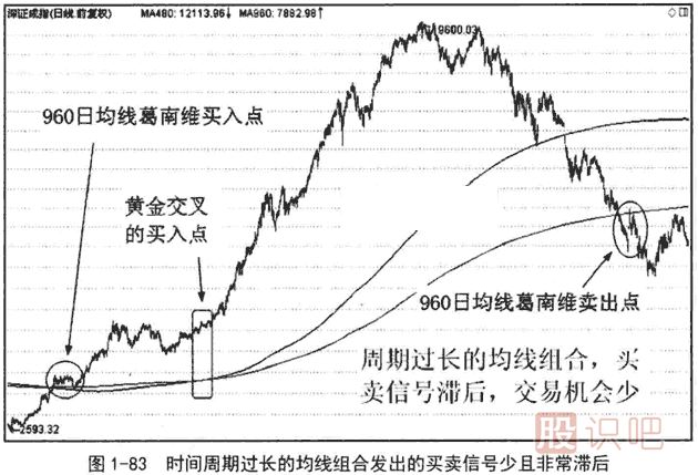 ①均線原本就存在滯后的特點,太長時間周期的均線組合將令該特點加倍放大,導(dǎo)致買入和賣出信號更加滯后,買入機(jī)會極少,甚至出現(xiàn)買點高于賣點的情形。