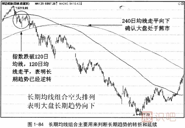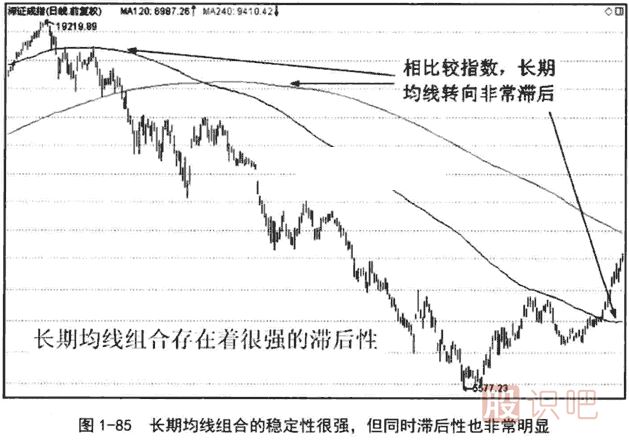 圖1-85是與圖1-84同一時間段的日線圖,從圖上觀察,當(dāng)120日均線和240日均線在頂部轉(zhuǎn)向時,指數(shù)已經(jīng)下跌較大一段了。尤其是240日均線轉(zhuǎn)向時,指數(shù)已下跌到那一輪熊市跌幅的一半,滯后性非常明顯。