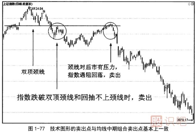 圖1-77是與圖1-76同一時間段的日線圖。在圖1-76中,跌破60日均線的大陰線同時也跌破了雙頂?shù)念i線。雙頂是轉(zhuǎn)勢技術(shù)圖形,有效跌破頸線應(yīng)賣出。跌破雙頂頸線后又回抽了一下頸線,回抽頸線不上,應(yīng)當繼續(xù)賣出。