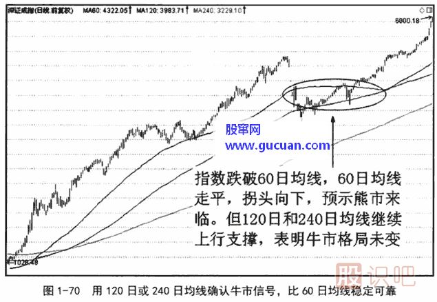120日和240日均線主要用來判斷大盤趨勢(shì)。和60日均線一樣,通常認(rèn)為:指數(shù)運(yùn)行在120日和240日均線之下,120日和240日均線下行,是熊市;指數(shù)運(yùn)行在120日均線和240日均線之上,120日均線和240日均線上行,是牛市。與60日均線相比,120日和240日均線更加穩(wěn)定可靠,但發(fā)出的信號(hào)也更滯后。