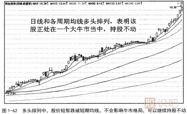 圖1-62是與圖1-61同一時(shí)間段的日線圖。該圖上有6條均線,分別為5日、10日、20日、60日、120日、240日均線。除了5日和10日均線以外,其余都是中長期均線。交易者可以觀察到,該股上漲過程中除了短期均線偶有交叉和粘合之外,中長期均線一直呈完美的多頭排列。多頭排列是非常重要的持股待漲技術(shù)形態(tài),交易者豈能輕易半途而廢?