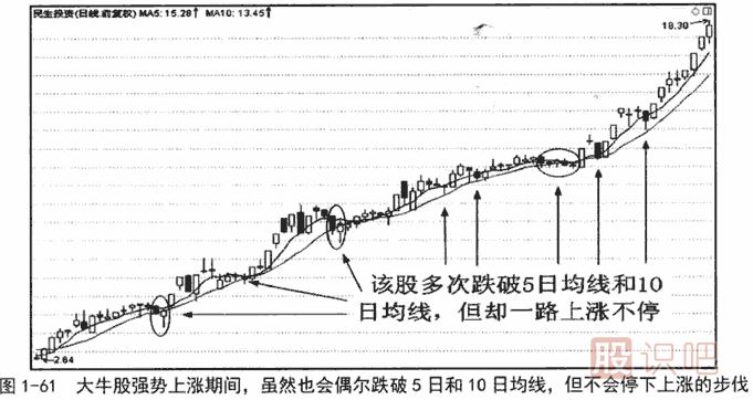 大牛股強(qiáng)勢(shì)上漲期間,股價(jià)跌破5日或10日均線時(shí)離場(chǎng)的交易者,除了錯(cuò)在沒有區(qū)分個(gè)股的強(qiáng)勢(shì)上漲和短期暴漲之外,還錯(cuò)在只看到了股價(jià)的短期波動(dòng),忘記了觀察和判斷中長期趨勢(shì)的方向。
