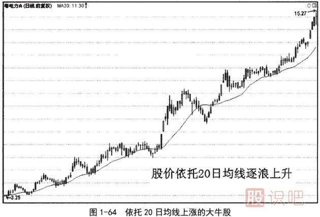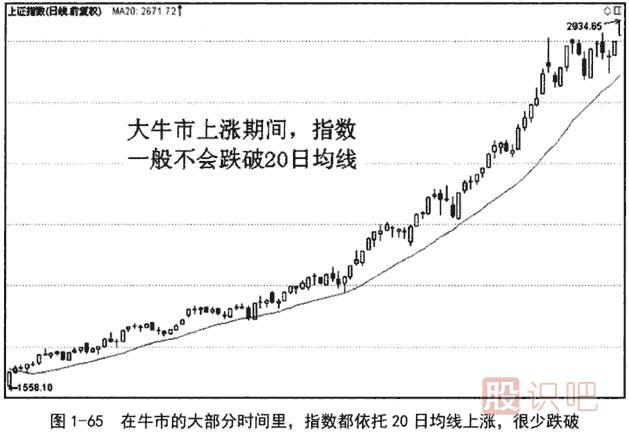 大牛市的大部分時(shí)間,或者大部分牛股,都是依托20日均線或30日均線上升的。同樣,大熊市的大部分時(shí)間,或者大部分大熊股,都是依托20日均線或30日均線下跌的。