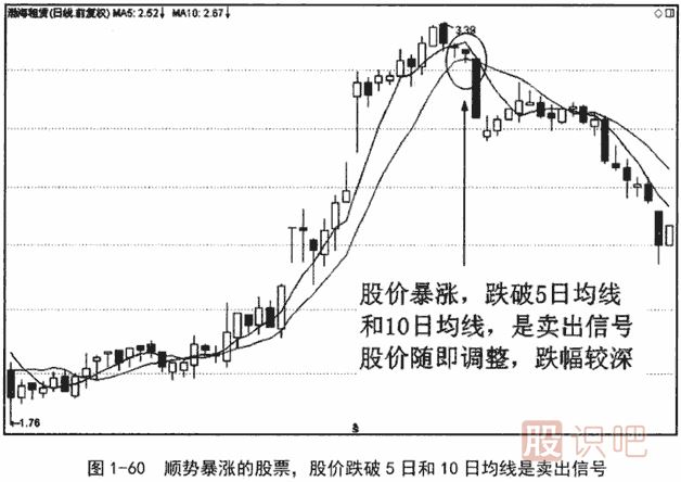 在長期的單邊市道,比如大牛市或大熊市中,股價(jià)或指數(shù)經(jīng)常會(huì)在短期內(nèi)沿著5日均線或10日均線暴漲暴跌。當(dāng)股價(jià)或指數(shù)跌破或站上5日均線或10日均線時(shí),常常是中短線尤其是短線交易者賣出或買進(jìn)的良機(jī),因?yàn)樵趩芜吺械赖捻槃?shì)暴漲暴跌時(shí),跌破5日均線或10日均線,大多會(huì)有一輪較大的調(diào)整,站上5日均線或10日均線,展開反彈常常是大概率事件。