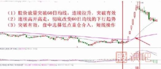 1、突破60日均線時要有明顯放大的成交量配合,隨后股價能夠站穩(wěn)于60日均線之上,否則后市可能還有較長時間反復。