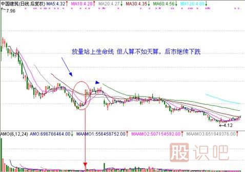 601668,中國建筑,2009年10月14日,股價也是放量站上生命線,但很可惜,后期中國建筑沒有發(fā)動上漲行情,后來證明這僅是下跌途中的一次反彈。問題出在哪里?當時中國建筑上市因大盤不好,這個倒霉孩子上市當日就破發(fā),上市后繼續(xù)下跌,股價在跌至4.8元附近,攻擊線和操盤線也已經(jīng)走平開始向上,當時的游資或者說敢死隊以為股價見底,悍然發(fā)動了突襲,股價2009年10月14日直封漲停,但中國建筑是個基金重倉股,很明顯游資的所為讓基金感覺到了股價的異動,隨后幾日并未配合游資拉升,當時游資選擇中國建筑也有失策的地方,這個股票盤子太久,啟動資金需要的太多,后市我估計明顯是游資資金鏈斷裂再也無力拉升,而資金則是通過繼續(xù)大幅殺跌把游資絞殺了。