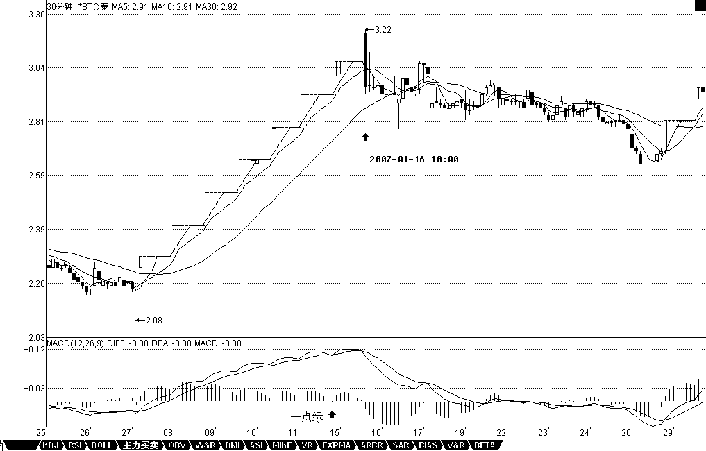 還有一種,就是股票不斷一字漲停,這時(shí)候,由于MACD設(shè)計(jì)的弱點(diǎn),在1分鐘、甚至5分鐘上,都會(huì)出現(xiàn)一波一波類似正弦波動(dòng)的走勢(shì),這時(shí)候不能用背弛來(lái)看,最簡(jiǎn)單,就是用1分鐘的中樞來(lái)看,只要中樞不斷上移,就可以不管。直到中樞上移結(jié)束,就意味著進(jìn)入一個(gè)較大的調(diào)整,然后再根據(jù)大一點(diǎn)級(jí)別的走勢(shì)來(lái)判斷這種調(diào)整是否值得參與。如果用MACD配合判斷,就用長(zhǎng)一點(diǎn)時(shí)間的,例如看30分鐘。一般來(lái)說(shuō),這種走勢(shì),其紅柱子都會(huì)表現(xiàn)出這樣一種情況,就是紅柱子回跌的低點(diǎn)越來(lái)越低,最后觸及0軸,甚至稍微跌破,然后再次放紅伸長(zhǎng),這時(shí)候就是警告信號(hào),如果這時(shí)候在大級(jí)別上剛好碰到阻力位,一但漲停封不住,出現(xiàn)大幅度的震蕩就很自然了。例如600385,在2。92那漲停,MACD出現(xiàn)一點(diǎn)的綠柱子,然后繼續(xù)漲停,繼續(xù)紅柱子,而3。28元是前期的日線高位,結(jié)果3。22漲停一沒(méi)封住,就開(kāi)始大幅度的震蕩。