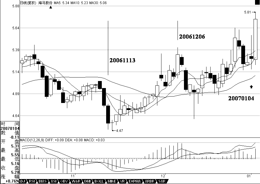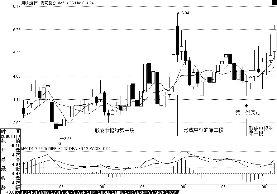 用最近漲得最厲害的一個(gè)股票來(lái)說(shuō)明,000572。該股票的力度,其實(shí)是和他在日線與周線上出現(xiàn)雙重的第二類買點(diǎn)有關(guān),相應(yīng)地,就有了MACD雙重在0軸停留形成第一個(gè)中樞的情況。在周線上,該股從20051209到20060714,形成第一段,同時(shí)MACD也回到0軸上面。其后就開(kāi)始形成第一個(gè)中樞,最終在20061117形成第二類買點(diǎn),同時(shí),黃白線在0軸附近橫盤(pán)。然后,開(kāi)始逐步擺脫該中樞,黃白線也逐步拉起。在日線上,這個(gè)過(guò)程也是一樣的, 20061113到20061206,形成日線上的第一段,同時(shí)MACD回到0軸上面。然后三段回拉在20070104結(jié)束,形成第一個(gè)中樞,其后突破中樞,MACD在0軸附近拉起,擺脫第一個(gè)中樞。該股以后的走勢(shì)就很簡(jiǎn)單了,首先形成一個(gè)至少是日線級(jí)別的新中樞,同時(shí)MACD回抽0軸,然后再突破,出現(xiàn)背馳,構(gòu)成一個(gè)大調(diào)整,從而導(dǎo)致一個(gè)至少周線以上級(jí)別的中樞,使得MACD出現(xiàn)回拉0軸,然后再拉起來(lái),出現(xiàn)背馳,其后的調(diào)整就大了去了,至少是月線級(jí)別的。