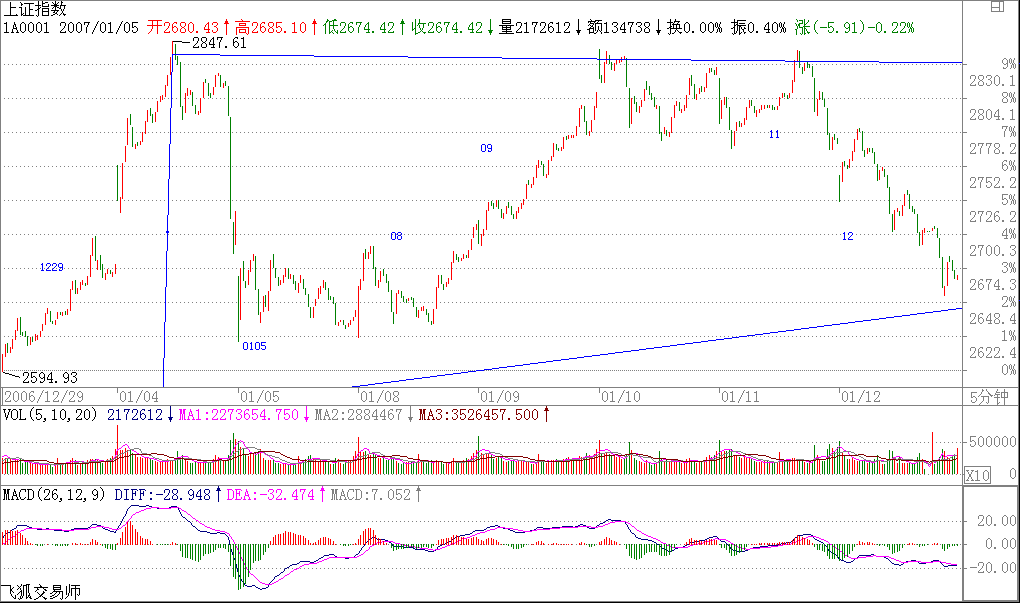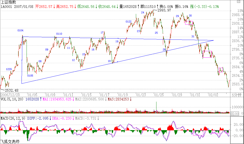 今天的走勢(shì),都看到了,就是一個(gè)漢奸殺跌的過(guò)程,技術(shù)上很簡(jiǎn)單,就是演化為一個(gè)復(fù)雜的調(diào)整.這在技術(shù)上是很正常的,理由前面已經(jīng)說(shuō)了,三角形后往往就是最后一段,但這只是30分鐘級(jí)別背馳引發(fā)的調(diào)整,2700點(diǎn)上下的中樞位置的波動(dòng)就是所有了.