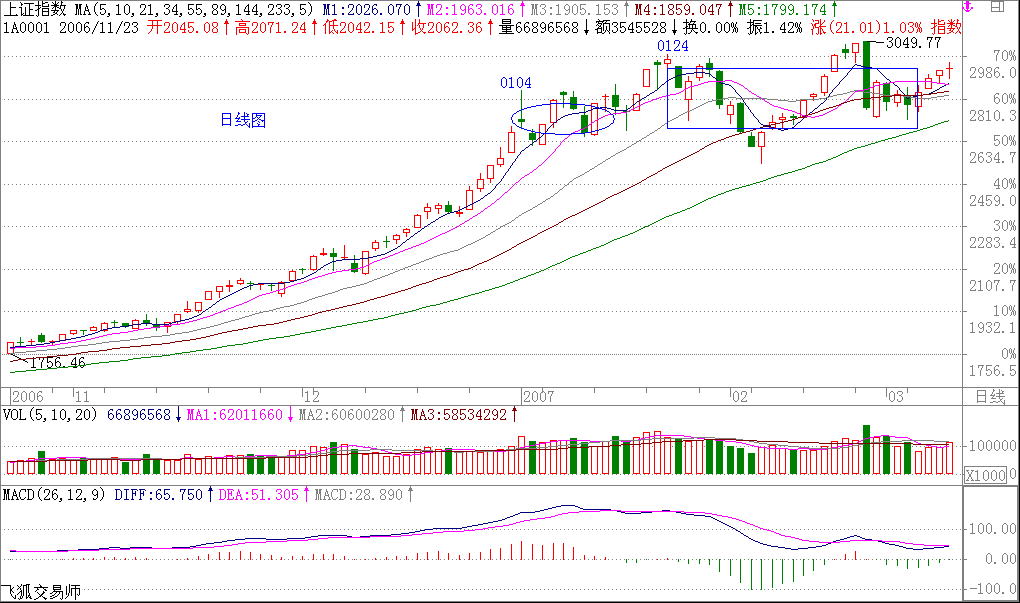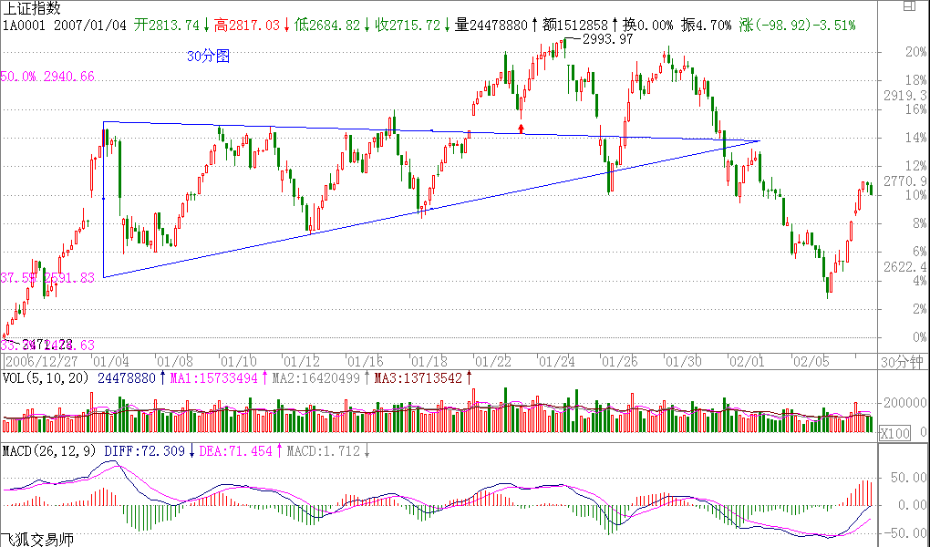 必須提醒,三角形一般是一段走勢(shì)的最后一個(gè)調(diào)整中經(jīng)常出現(xiàn)的,因此,三角形出現(xiàn)后,其后的走勢(shì)就要時(shí)刻小心了。當(dāng)然,這只是對(duì)30分鐘而言,而日線上要出現(xiàn)大調(diào)整,還早著。所以,密切關(guān)注30分鐘或60分鐘的圖形,一旦出現(xiàn)背馳,就可以打點(diǎn)短差了。