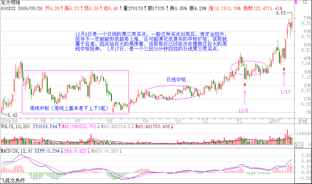 =====600832的走勢比較復雜,12月8日是一個日線的第三類買點。一般這種買點出現(xiàn)后,肯定會回升,但并不一定就能形成趨勢上漲,還可能演化成復雜的中樞擴張,該股就屬于后者。因此站在大的角度看,該股現(xiàn)在已經(jīng)逐步在擺脫這巨大的周線中樞延伸。
