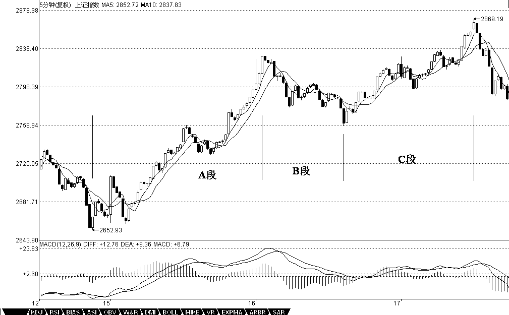 必須說明的是,由于MACD本身的局限性,要精確地判斷背馳與盤整背馳,還是要從中樞本身出發(fā),但利用MACD,對一般人理解和把握比較簡單點,而這已經(jīng)足夠好了。光用MACD輔助判斷,即使你對中樞不大清楚,只要能分清楚A、B、C三段,其準確率也應該在90%以上。而配合上中樞,那是100%絕對的,因為這可以用純數(shù)學的推理邏輯地證明,具體的證明,以后會說到。